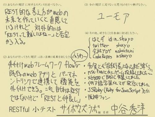 前回の記事に書いたとおり、「RESTful Web Services」の第2回読書会に参加してきた。 第5章「読み取り専用のリソース指向サービス」の担当をして、まあつとつとと読み解いて説明してみたりしたわけだが、その前にポジションペーパーで自己紹介するというイ…